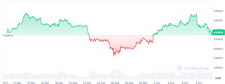 Ethereum fällt zurück auf 4.300 US-Dollar